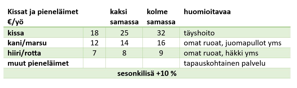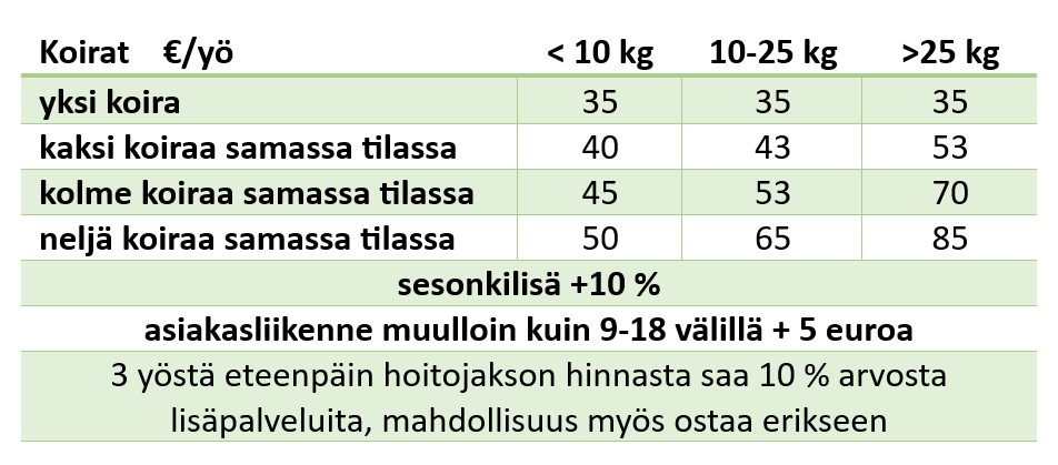 Hoitojakson hinta muodostuu yöpymisten määrästä. Alennuksia/tarjouksia ei ole, vaan pidempiin jaksoihin lemmikkisi saa ekstravirikkeitä ja -huolenpitoa valintasi mukaan. Hinnat sisältävät alv 25,5 %