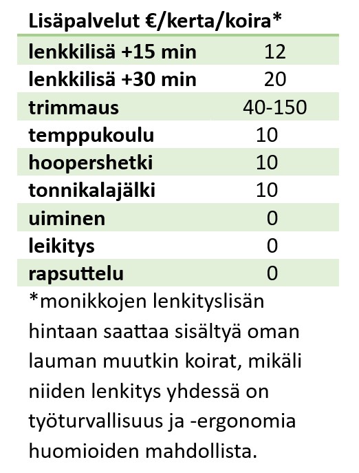 Esimerkiksi yhden koiran neljän yön reissu (to-ma) maksaa 140 euroa ja sen myötä saat valita 14 euron edestä lisäpalveluita.