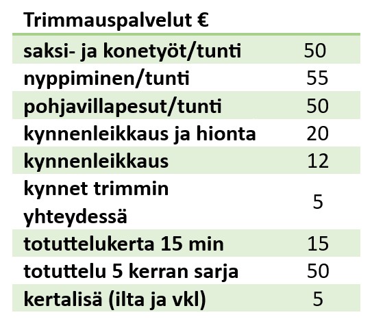 Lapsenhoidollisista syistä trimmaukset on meille helpoin saada toteutumaan ”virastoaikaan” ja senpä vuoksi arki-iltaisin klo 17 jälkeen alkavat trimmausajat ja viikonloppuisen tehtävät trimmit onnistuvat viiden euron lisähinnalla.